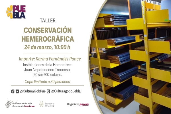 La Secretaría de Cultura impartirá el taller gratuito “Conservación hemerográfica”, el 24 de marzo a las 10:00 horas en las instalaciones de la hemeroteca “Juan Nepomuceno Troncoso” (20 Sur número 902, sótano, colonia Azcarate).