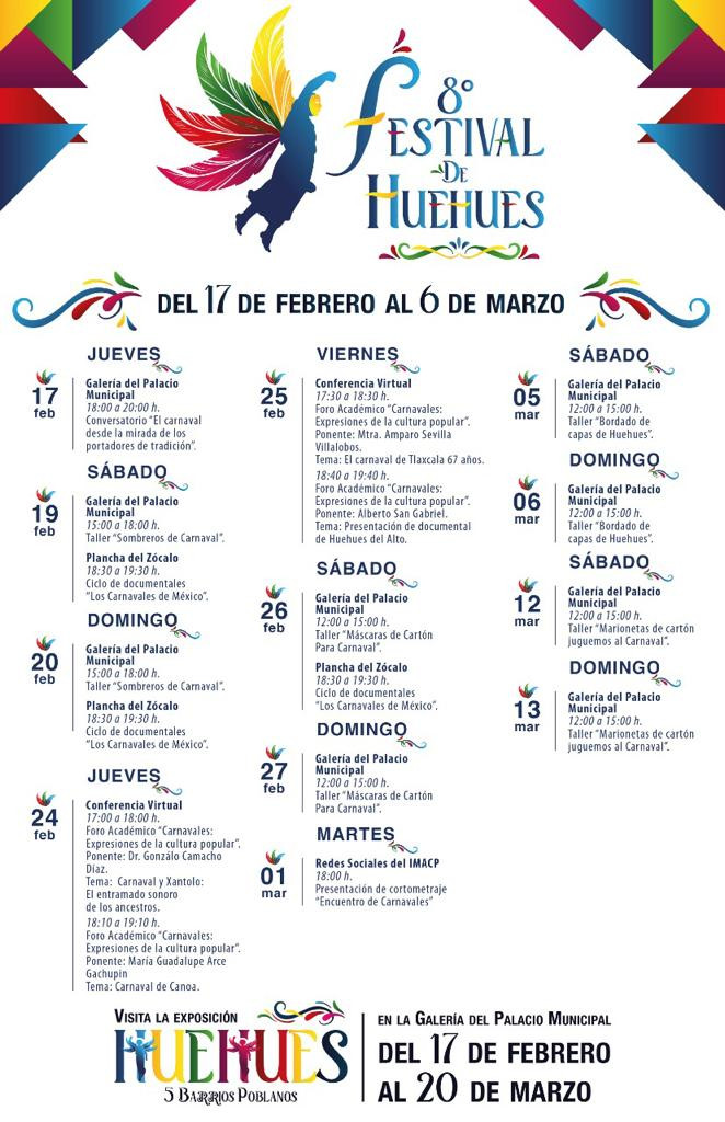 El 8° Festival de Huehues contempla la realización de otras actividades hasta el 6 de marzo, como conferencias virtuales, foros académicos, talleres de bordado de capas y de cartonería para máscaras, así como la presentación del cortometraje “Encuentro de Carnavales”. Para conocer a detalle esta agenda, se puede consultar el programa completo en pueblacapital.gob.mx.