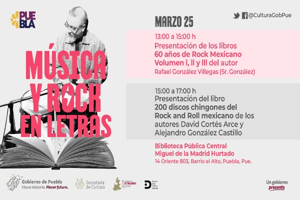 El gobierno de Puebla, a través de la Secretaría de Cultura, llevará a cabo el programa “Música y rock en letras” en la Biblioteca Pública Central “Miguel de la Madrid Hurtado” (14 Oriente 803, Barrio El Alto), con el que presentará siete libros mexicanos escritos por personalidades de la música en el país.
