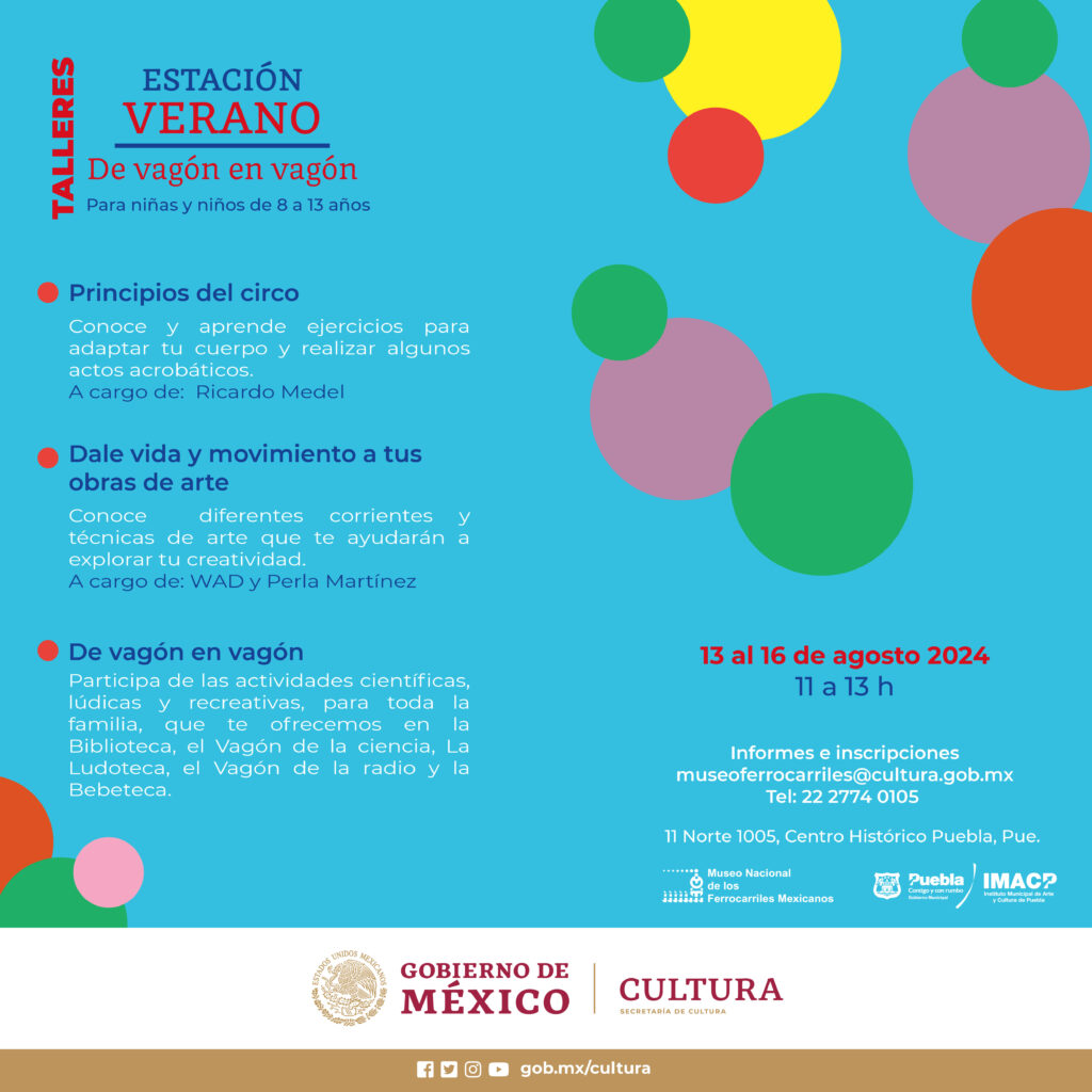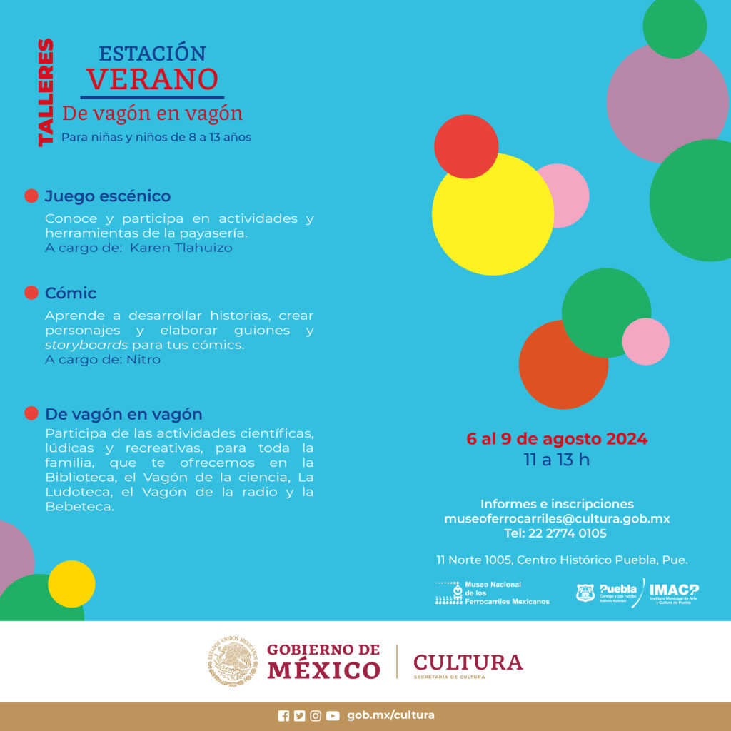 La Secretaría de Cultura del Gobierno de México, a través del Museo Nacional de los Ferrocarriles Mexicanos (MNFM), en colaboración con el Instituto Municipal de Arte y Cultura de Puebla, llevará a cabo el festival “Estación verano”, el cual contempla la realización de talleres y eventos culturales para niños, niñas, jóvenes y personas adultas.