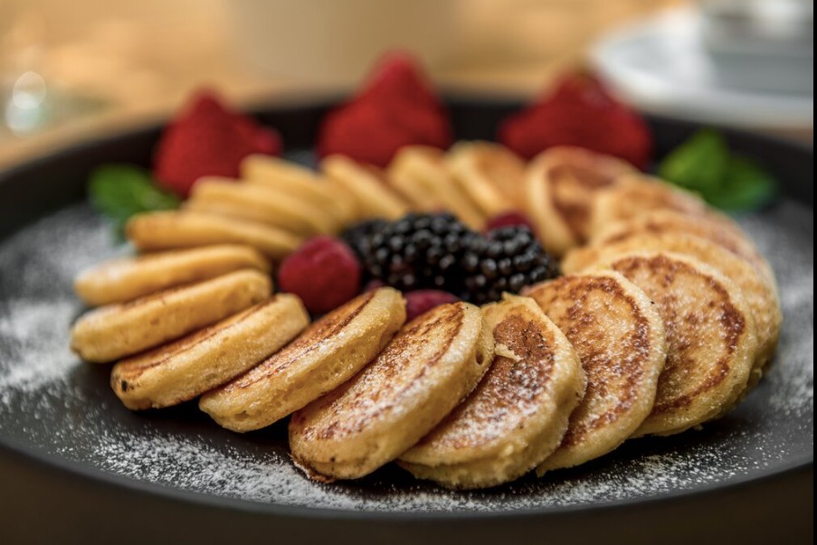 Pero también hay platillo tradicionales, sin embargo el montaje lo hace atractivo para el comensal. Por ejemplo mini hotcakes cuyo montaje es una belleza y se antoja devorar.