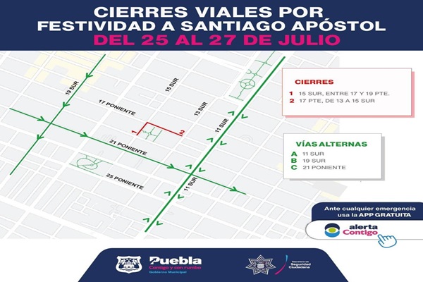 De igual manera, a través de la Secretaría de Seguridad Ciudadana (SSC), se implementará un cierre vial en la 17 Poniente entre 13 y 15 Sur y sobre la 15 Sur, entre la 17 y 19 Poniente; la zona quedará libre de comercio a primera hora del día 28 de julio, tras la fiesta de Santiago Apóstol.