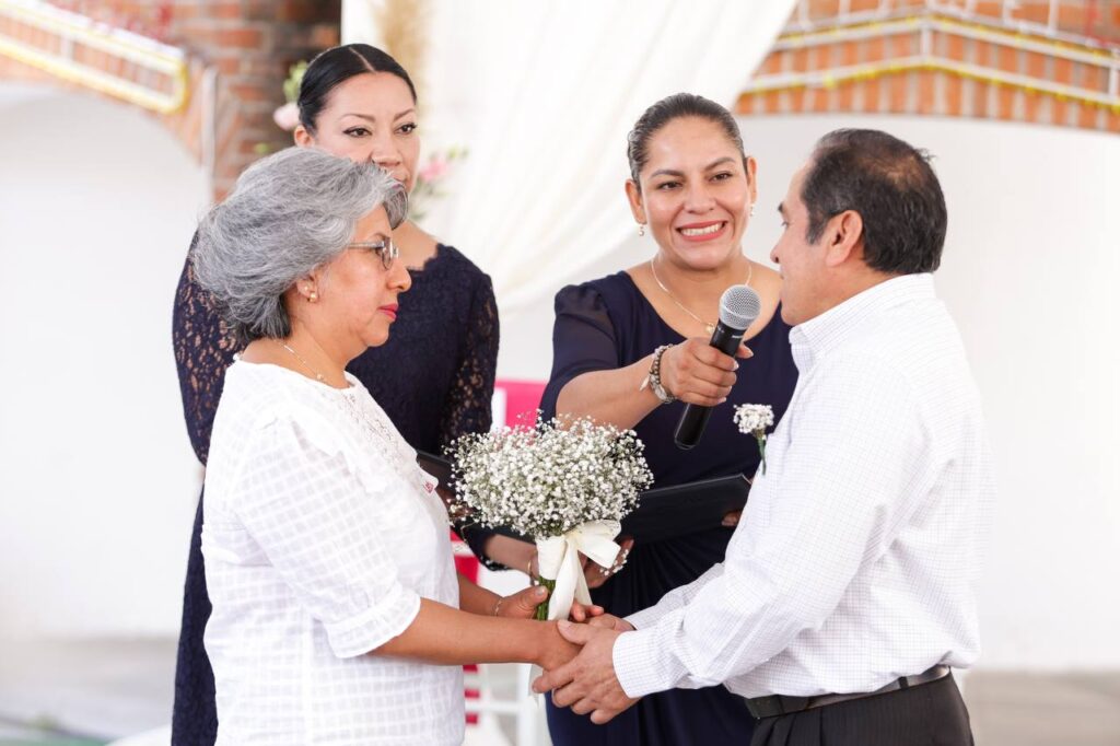 Al concluir la ceremonia, las y los contrayentes recibieron sus actas de matrimonio, sellaron su unión con el tradicional beso y participaron en un brindis y partida de pastel en compañía de sus familiares y autoridades municipales. El ambiente estuvo acompañado de música en vivo y un emotivo arco floral que enmarcó la celebración.