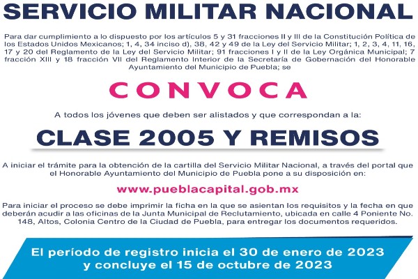 En pueblacapital.gob.mx., jóvenes nacidos en 2005 y remisos ya podrán iniciar el trámite para obtener su Cartilla del Servicio Militar Nacional, toda vez que la Secretaría de Gobernación del Ayuntamiento de Puebla abrió la convocatoria de registro.
