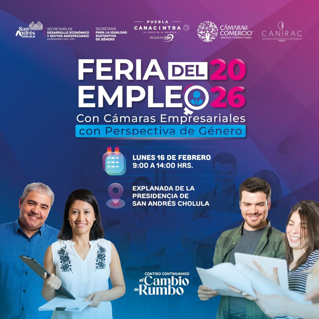 La presidenta municipal de San Andrés Cholula, Lupita Cuautle, en conjunto con los presidentes de la Cámara de Comercio, Servicios y Turismo de Puebla (CANACO), Manuel Flores Fernández y de la Cámara Nacional de la Industria de Transformación Puebla (CANACINTRA), Carlos Julián Sosa Spínola, presentó la “Feria del Empleo 2026 con Perspectiva de Género”.