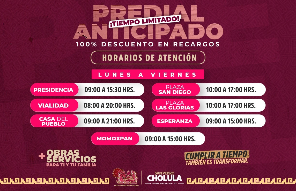 Al respecto, Tonantzin Fernández invita a las y los cholultecas a continuar realizando el pago de sus respectivos impuestos, pues, con ello, se garantizan más y mejores servicios y obras públicas para las 13 juntas auxiliares y la cabecera municipal.
