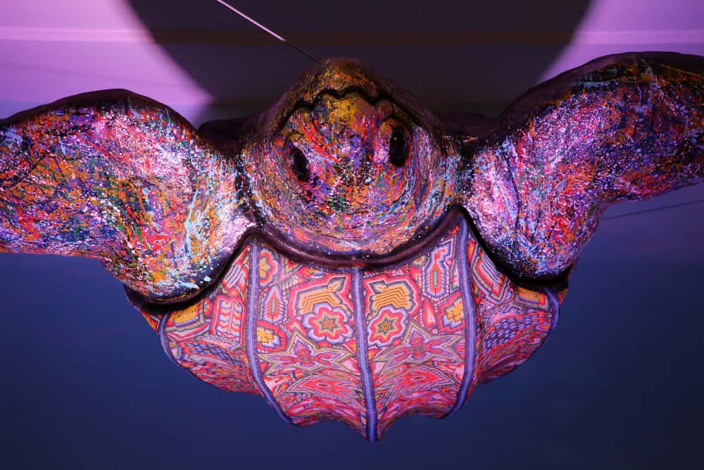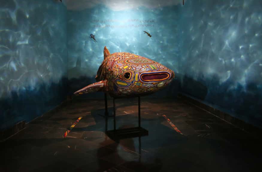 La exposición, inaugurada el pasado 17 de julio, fusiona el arte huichol con materiales contemporáneos y un poderoso mensaje ambiental. A través de esculturas monumentales decoradas con chaquira tradicional y plásticos recolectados en playas mexicanas, Menchaca invita a reflexionar sobre la urgencia de proteger los océanos.