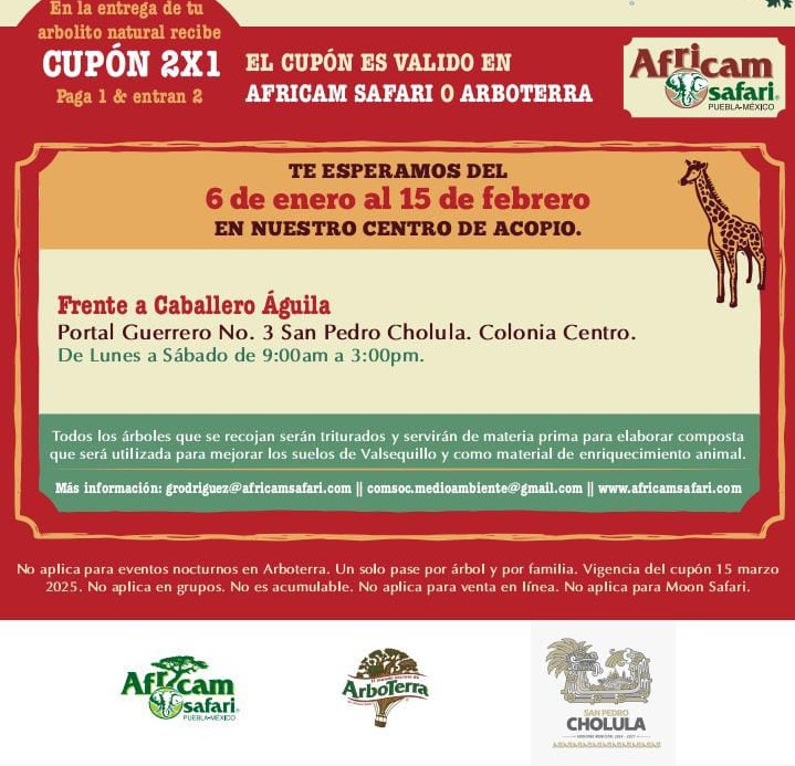 Las y los participantes de en la iniciativa “Verde Navidad” podrán acudir al Museo Caballero Águila con su árbol de navidad a partir del 6 de enero y hasta el 15 de febrero, de lunes a sábado en un horario de 09:00 a 15:00 horas, donde obtendrán su cupón 2×1 para asistir a las instalaciones de Africam Safari o ArboTerra.