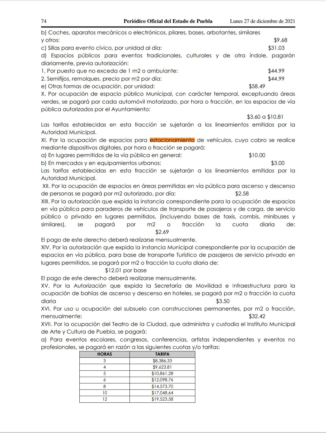 También se establece una tarifa especial de tres pesos para poderse estacionar en mercados o en equipamiento urbano.
