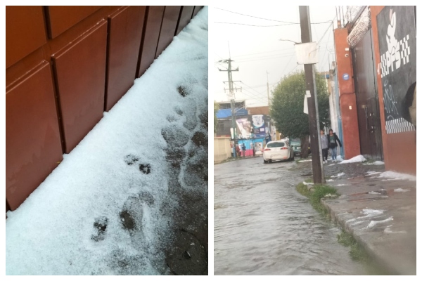 En la colonia Historiadores se puede apreciar granizo blanco y calles anegadas de agua en Clavijero.