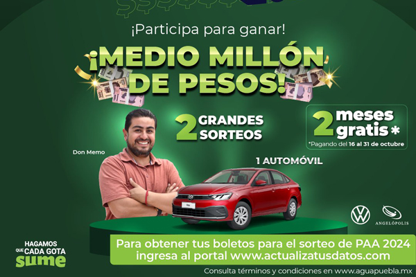 Además, todos los usuarios que paguen por adelantado sus servicios de agua, drenaje y saneamiento del año próximo, participarán en 2 grandes sorteos: el primer premio será de medio millón de pesos y en el segundo se rifará un automóvil último modelo.