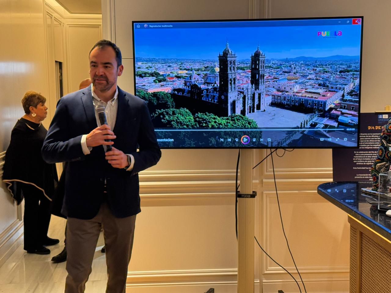 Posteriormente, Oropeza Casas y Carlos Huerta hicieron una presentación de la ciudad de Puebla como destino, destacaron atractivos, como la gastronomía, el patrimonio y la cultura, así como cualidades, entre ellas la ubicación geográfica, la seguridad, la amplia gama de servicios turísticos y la hospitalidad de su gente.