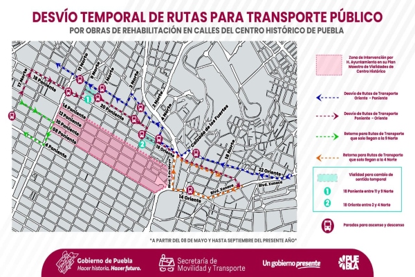 Ayer el gobierno municipal anunció que 71 rutas de transporte público que circulan por el Centro Histórico de Puebla serán desviadas temporalmente a otras calles el próximo 6 de mayo, esto debido a las 93 calles que intervendrá el ayuntamiento, dentro de las que se encuentra la 10, 12, 14 y 16 Oriente-Poniente, así como un tramo de la 18.