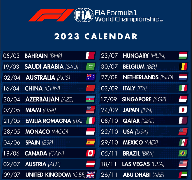 La Federación Internacional de Automovilismo (FIA) confirmó este martes el calendario 2023 de la Fórmula 1 tras su aprobación por los miembros del Consejo Mundial del Deporte Automovilístico.