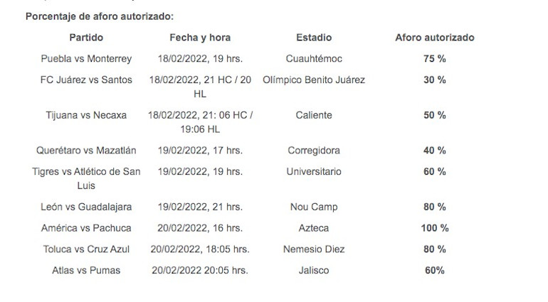 El único partido que tendrá aforo al 100% será el que se jugará entre América y Pachuca el domingo 20 de febrero de 2022 a las 16 horas, esto debido a que el semáforo se encuentra en color amarillo en la Ciudad de México.