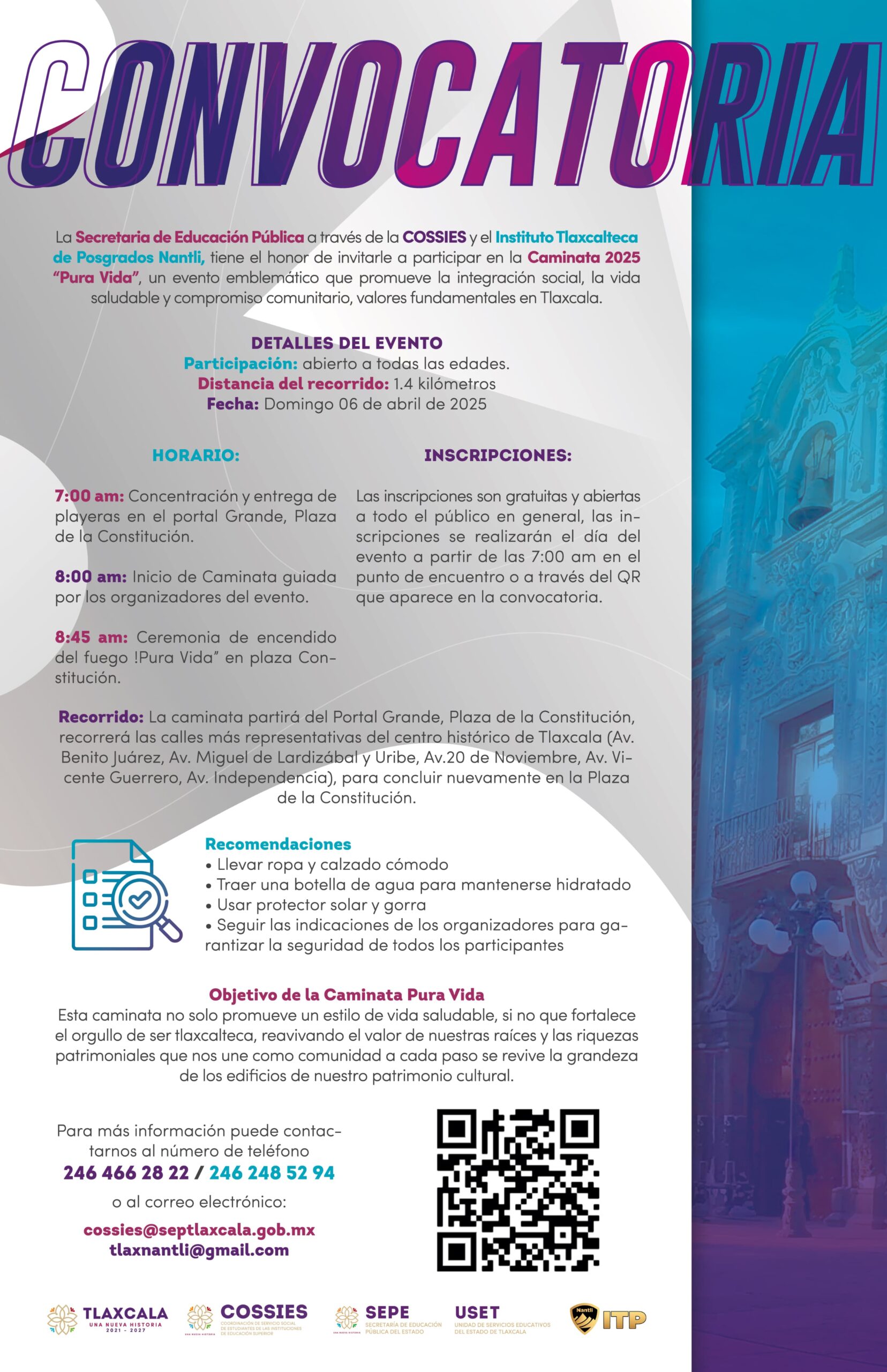 La Secretaría de Educación Pública (SEP) a través de la Coordinación de Servicios Social de Instituciones de Educación Superior (Cossies) y el Instituto Tlaxcalteca de Posgrados Nantli, invitan a participar en la primer Caminata 2025 “Pura Vida”, un evento emblemático que promueve la integración social, la vida saludable, compromiso comunitario y apreciación de la rica cultura de nuestros edificios históricos, valores fundamentales en Tlaxcala.