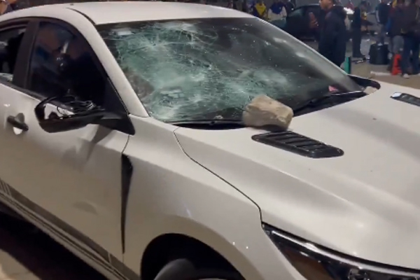 Desde adentro del estadio se grabó como se lanzaron piedras y objetos contundentes; un vehículo blanco recibió varios impactos, sin que interviniera la policía desplegada en los alrededores del recinto.