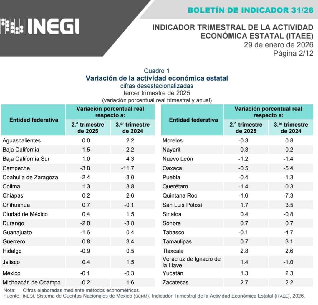 Tlaxcala se posicionó como el estado con mayor crecimiento en su actividad económica durante el tercer trimestre del 2025, de acuerdo con cifras preliminares publicadas por Inegi.