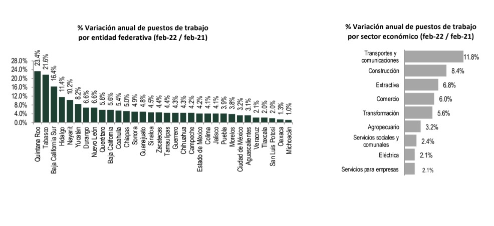 Las entidades con el mayor número de trabajadores asegurados en febrero fueron Quintana Roo, Tabasco, Baja California Sur, Hidalgo, Nayarit y Yucatán con variaciones anuales de 23 a 8.2 por ciento.
