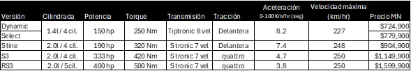 El Audi A3 Sportback se reincorpora al portafolio de productos en México, de acuerdo con la demanda del mercado local. Este modelo emblemático ya se encuentra disponible en todas las concesionarias Audi del país en las versiones: Dynamic, Select, S Line, el deportivo S3 y el súper deportivo RS3, bajo las siguientes motorizaciones y precios: