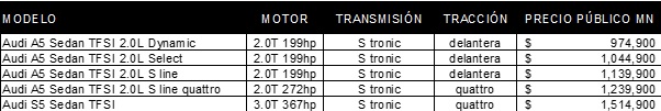 El nuevo A5 Sedán, producido en la fábrica de Neckarsulm, se encuentra ya disponible para pedidos en el mercado mexicano en las siguientes versiones y precios: