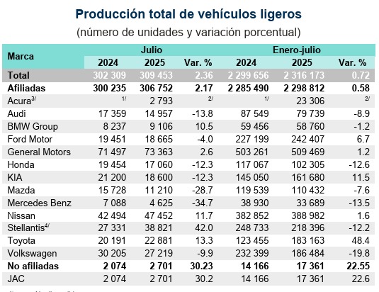Sólo seis armadoras crecieron en producción: Toyota con un 48 por ciento, JAC con 22.6 por ciento, KIA 11.6, Ford 6.7, Nissan 1.6 y General Motors 1.2 por ciento.
