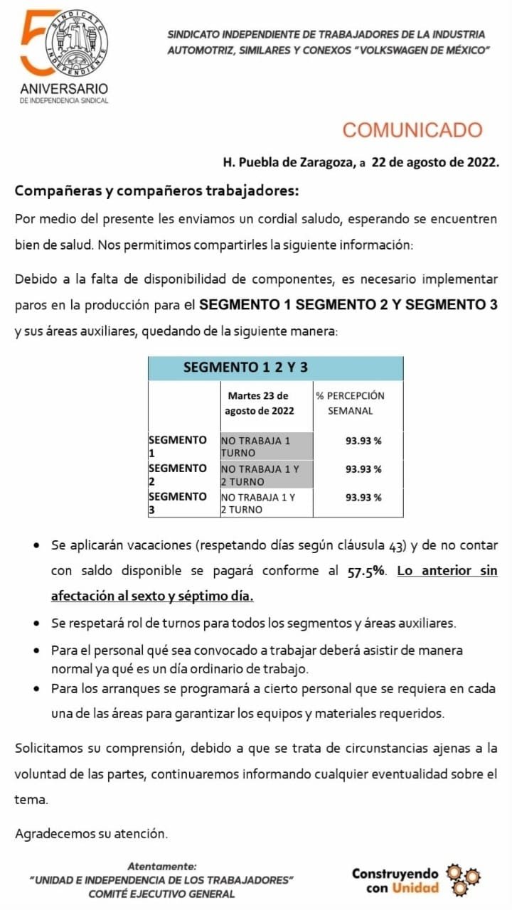 El Sindicato Independiente de Trabajadores de la Industria Automotriz Volkswagen (Sitiavw) informó en un comunicado que las actividades se retomarán en el tercer turno de este día.