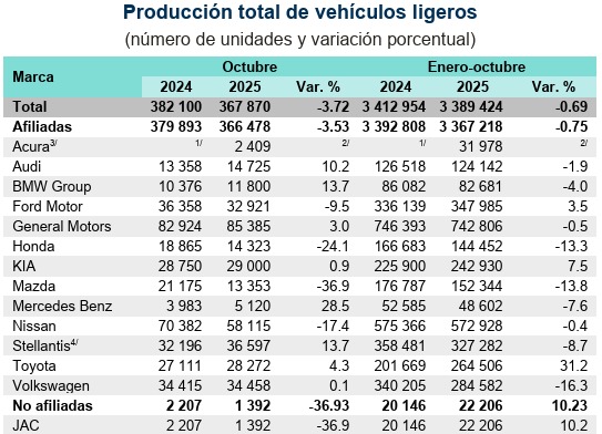 Dicho volumen de vehículos está 1.9 por ciento debajo de los niveles reportados en el mismo periodo de hace un año y necesita alrededor de 20 mil unidades para superar su producción de 2024.
