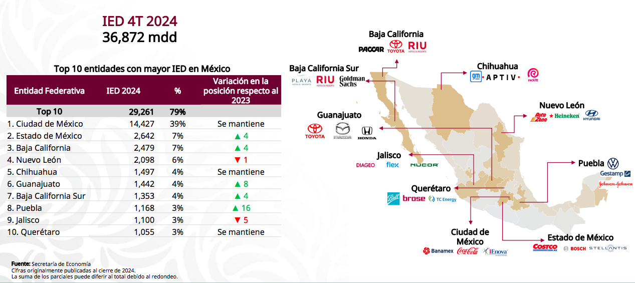 Ciudad de México es la entidad con mayor monto captado de IED del país durante el cuarto trimestre de 2024 con un monto de 14 mil 427 millones de dólares que representa el 39% del país. Los principales inversores son: Banamex, Coca-Cola e IEnova.