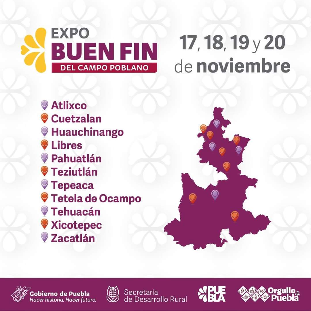 La Secretaría de Desarrollo Rural (SDR) del estado de Puebla anunció este viernes Expo Buen Fin del Campo, que se llevará a cabo en 11 municipios de la entidad del 17 al 20 de noviembre.