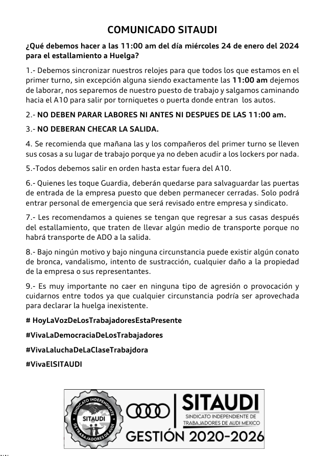 Es importante mencionar que las negociaciones se retomaron este martes 23 de enero, a las 10 de la mañana, en la Ciudad de México, luego de once días de pausa, y tras una consulta interna en el Sitaudi donde 93% de los trabajadores que votaron rechazaron la propuesta dela empresa para aumentar solo 5% el salario y las prestaciones.