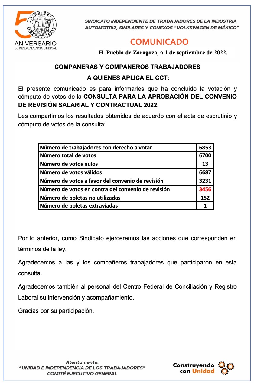 Un total de 3 mil 456 trabajadores de Volkswagen de México votaron en contra el acuerdo de alza salarial de 11% y de revisión del Contrato Colectivo de Trabajo (CCT).