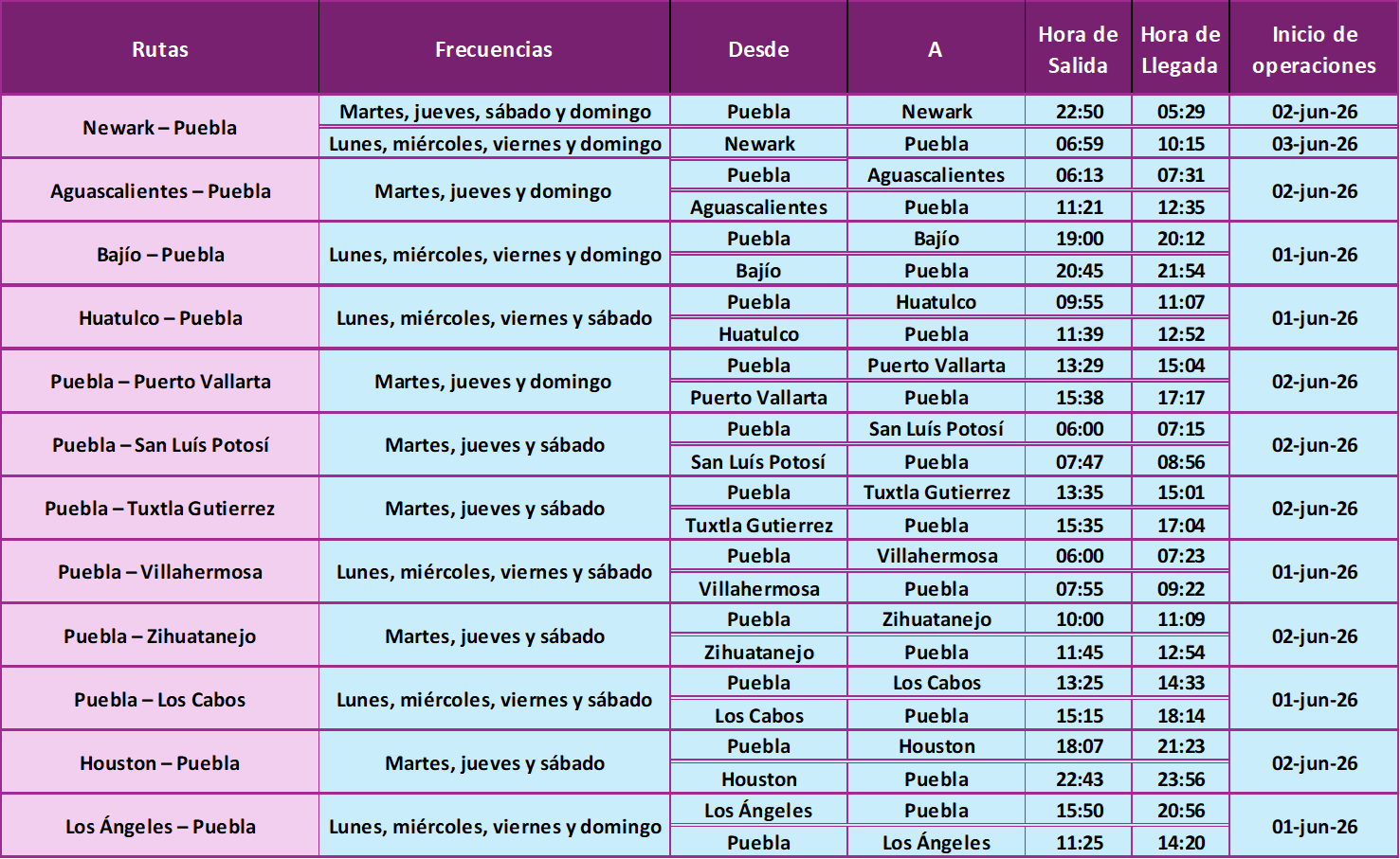Los boletos de las nuevas rutas que conectan a la Ciudad de Puebla estarán a la venta a partir de hoy. Las operaciones iniciarán el 1 y 2 de junio, con frecuencias programadas de acuerdo con la demanda de cada mercado y horarios diseñados para facilitar conexiones eficientes tanto para viajeros de negocios como de placer.