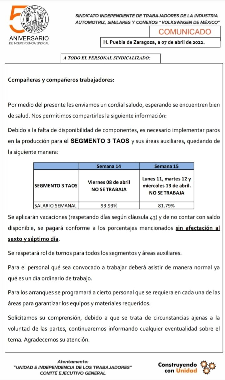 Fue el Sindicato Independiente de Trabajadores de la Industria Automotriz Volkswagen (SITIAVW) la instancia que comunicó de la detención de la fabricación de autos.