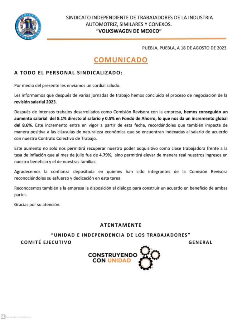 El acuerdo alcanzado entre Volkswagen de México y el sindicato es superior a la inflación anual acumulada, que se ubicó en 4.79% al mes de julio de 2023, por lo que se considera que el monto de incremento salarial es histórico.