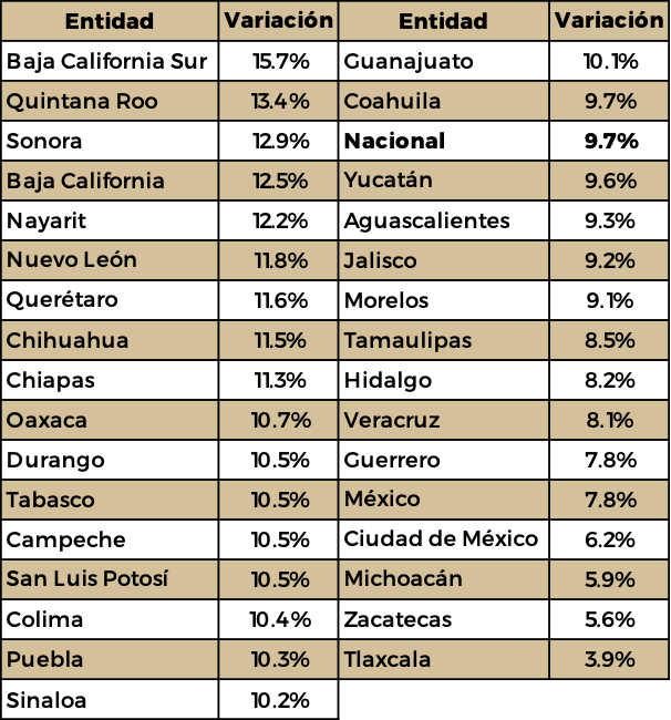 Esta cifra, refleja que en Puebla los ajustes en los precios de las viviendas supera al promedio nacional que se ubicó en 9.7% para el periodo que se informa y por encima de los ajustes que se registraron en la Ciudad de México y el Estado de México, donde las cifras se mantuvieron por debajo del promedio, con 6.2% y 7.8%, respectivamente.