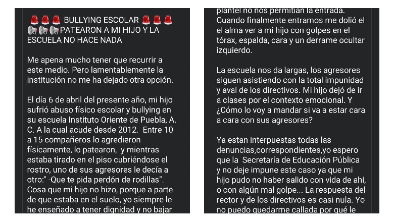 La familia del menor, hermana y madre, esta última de nombre Guadalupe T. reveló que su hijo fue acosado, pateado y golpeado por “El Rebaño”, un grupo de alumnos del Instituto Oriente que son conocidos por agredir a los estudiantes.