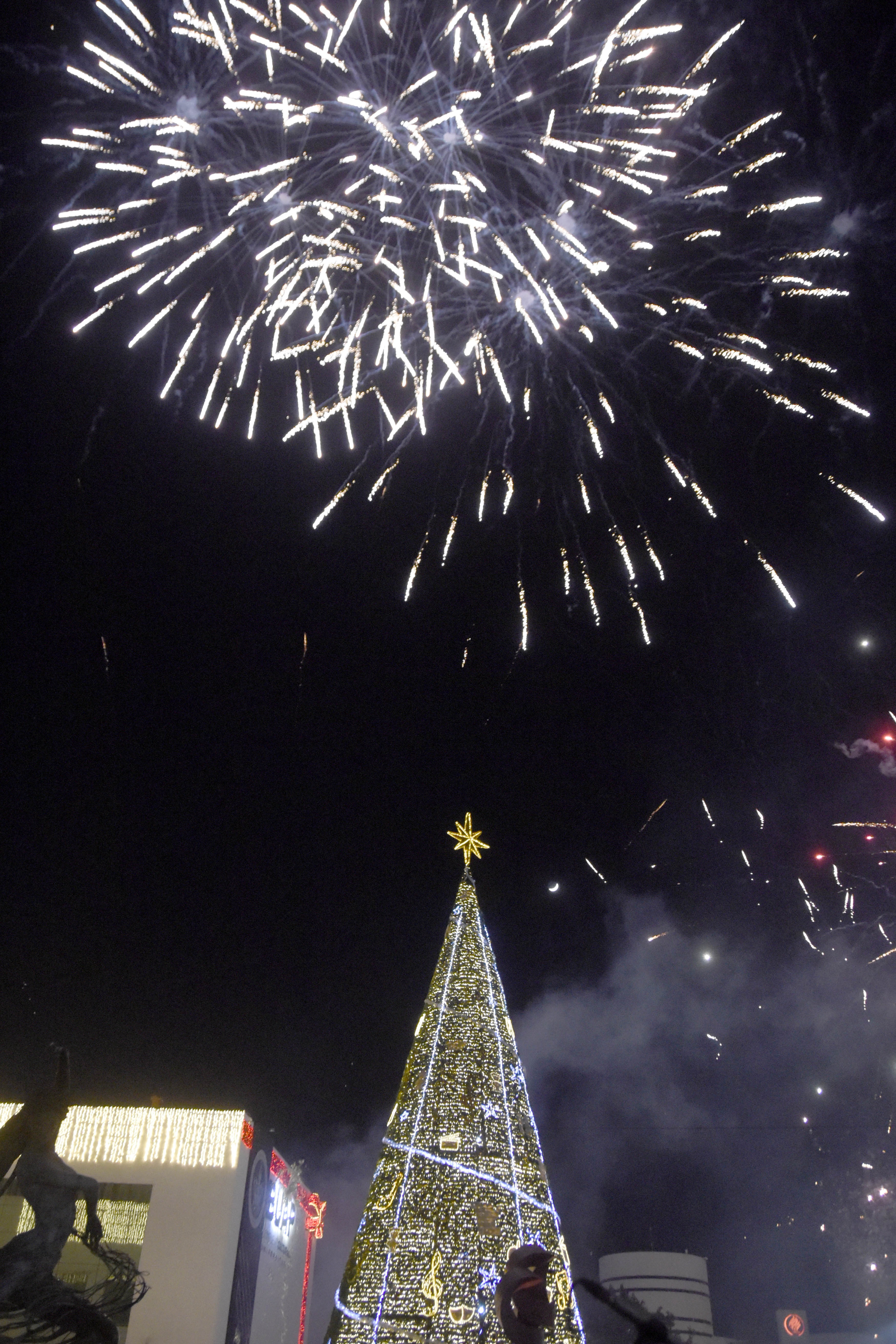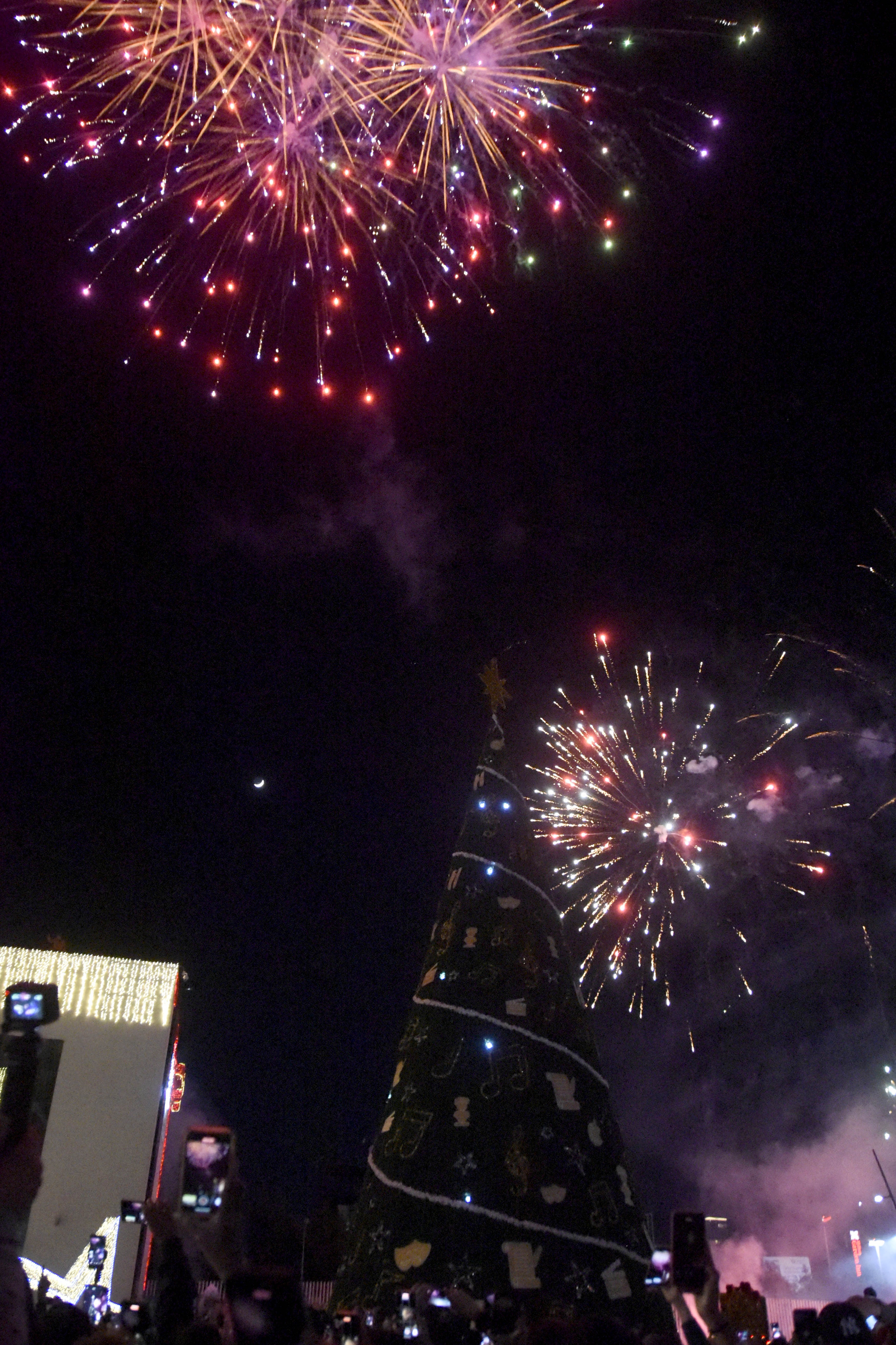 Después de la cuenta regresiva para presionar el botón e iluminar las 90 mil luces led del Árbol de Navidad, de 30 metros de altura, con 7 mil 200 metros cuadrados de escarcha, 186 series de 500 luces cada una y figuras alusivas a las bellas artes, la Rectora Lilia Cedillo Ramírez dio un mensaje de paz y compartió sus mejores deseos para el año venidero.