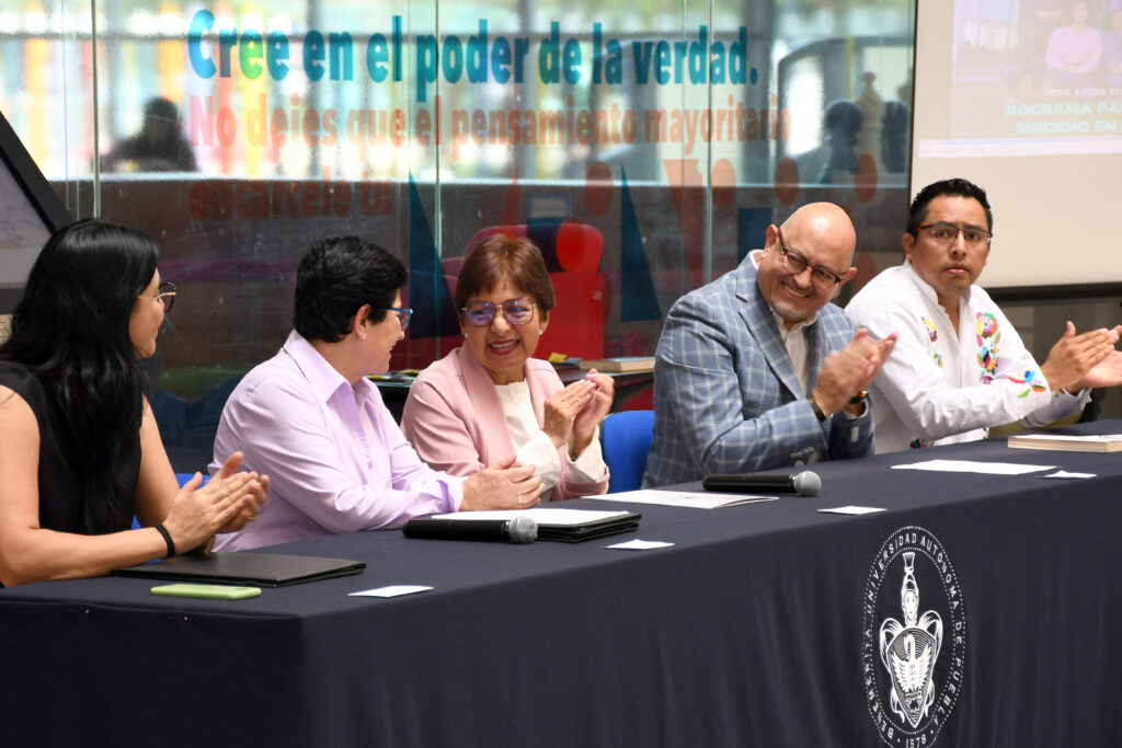 En el presídium también estuvieron Alfredo Avendaño Arenaza, director General de Bibliotecas; Claudia Flores Arévalo, psicóloga de la Dirección de Acompañamiento Universitario; y el traductor Ángel Salvador García Hernández.