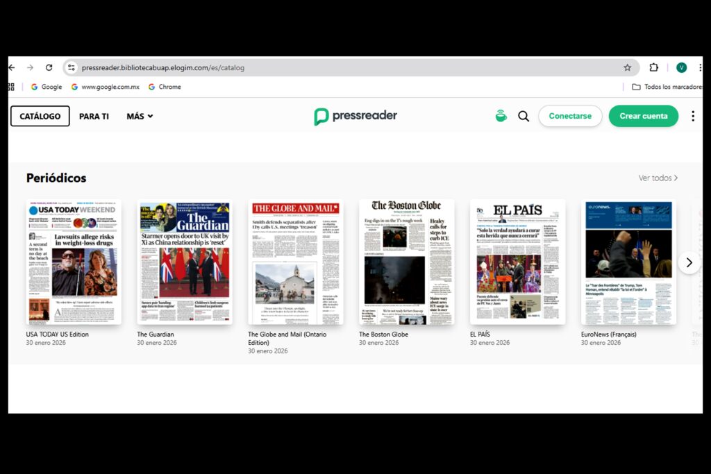 Detalló que la plataforma de PressReader está disponible para la comunidad universitaria en www.bibliotecas.buap.mx, en el apartado de biblioteca digital.