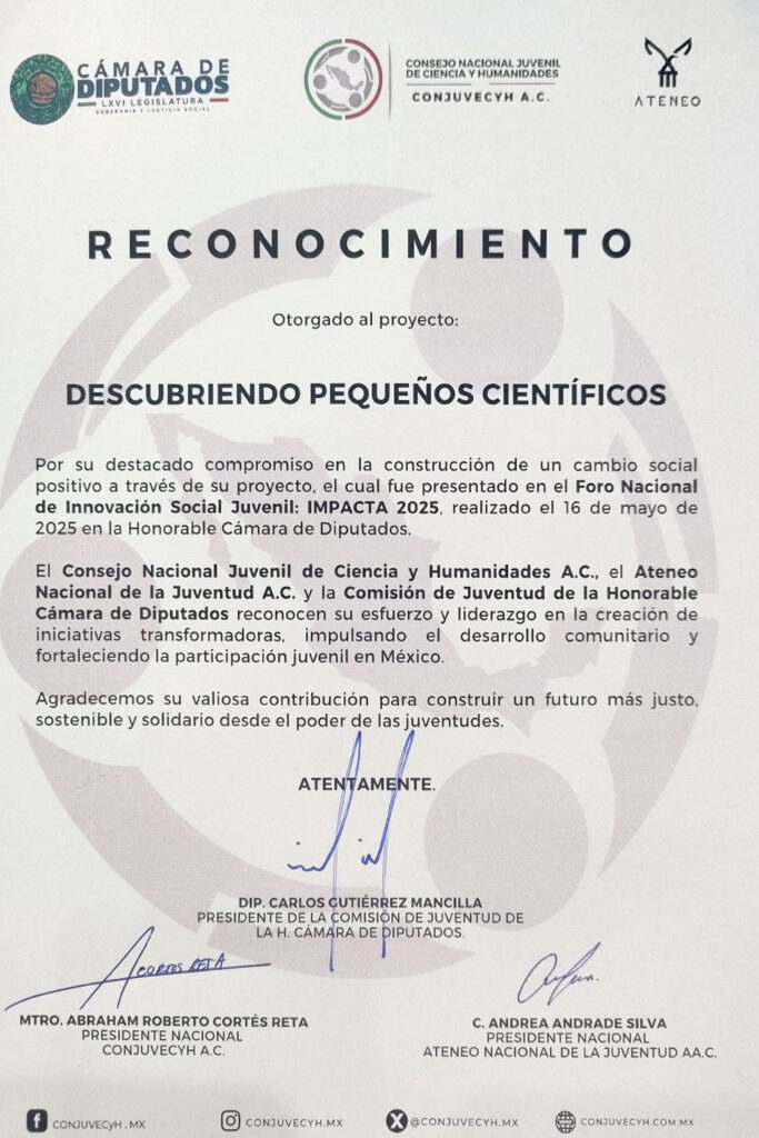 “Descubriendo Pequeños Científicos” fue electo entre múltiples propuestas de grupos provenientes de distintos estados del país, gracias a su valioso trabajo que acerca la ciencia a niñas y niños en contextos vulnerables, fomentando la curiosidad, el pensamiento crítico y la inclusión desde edades tempranas.