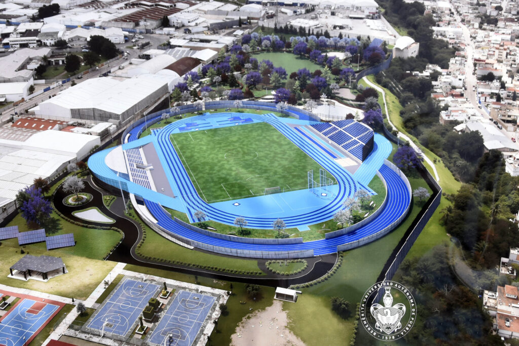 La pista de atletismo se ubicará al norte del predio del plantel. Se intervendrán aproximadamente 82 mil 243 metros cuadrados y las edificaciones tendrán una construcción de 8 mil 828 metros cuadrados. En la obra exterior, una pista de atletismo de 400 metros con ocho carriles, con una superficie de 4 mil 639 metros cuadrados; pista de calentamiento de 6 mil 975 metros cuadrados y cancha de fútbol profesional de 7 mil 965 metros cuadrados. Además, espacios complementarios de esta disciplina, como lanzamiento de jabalina.