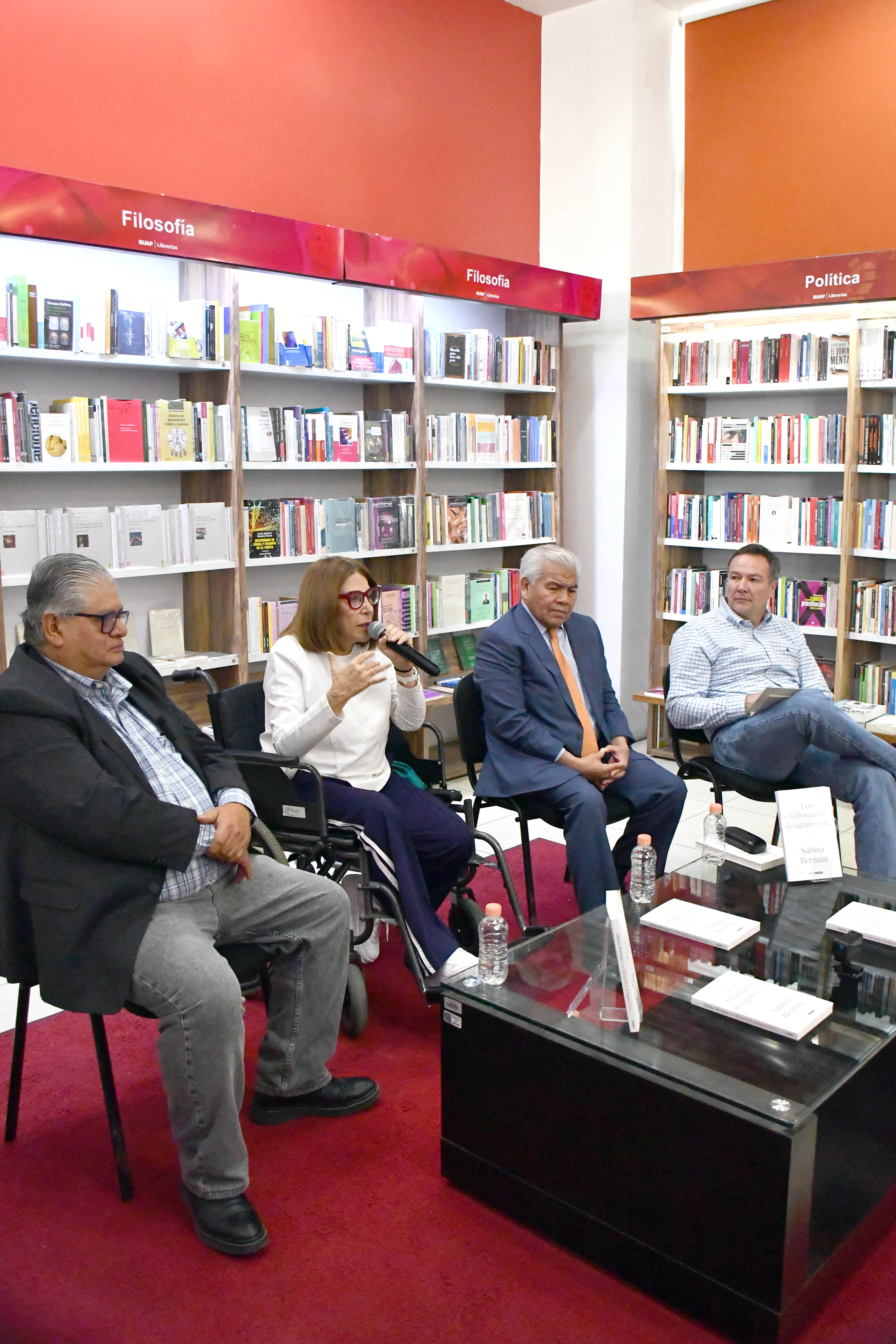 Finalmente, el doctor Humberto Morales Moreno hizo referencia a la relación que guarda la obra de Sabina Berman con los planteamientos que hace Marx respecto a los mecanismos sociales y la concepción de dinero y economía. Al respecto, la autora coincidió al señalar que su literatura también plantea la relación de cada persona con algo tan abstracto como es el dinero, detonante de las decisiones que toman los billonarios y que rigen la suerte del resto de las personas.