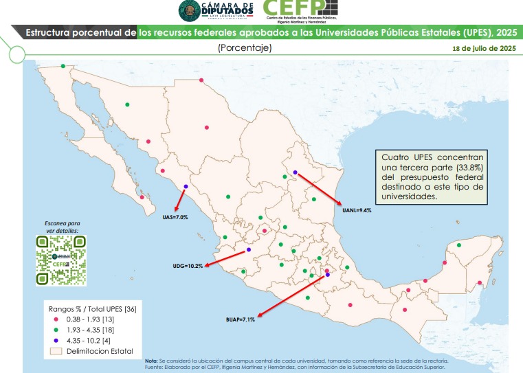 Dicho monto representa el 7.1 por ciento de la bolsa total de recursos aprobados a las Universidades Públicas Estatales UPES 2025.