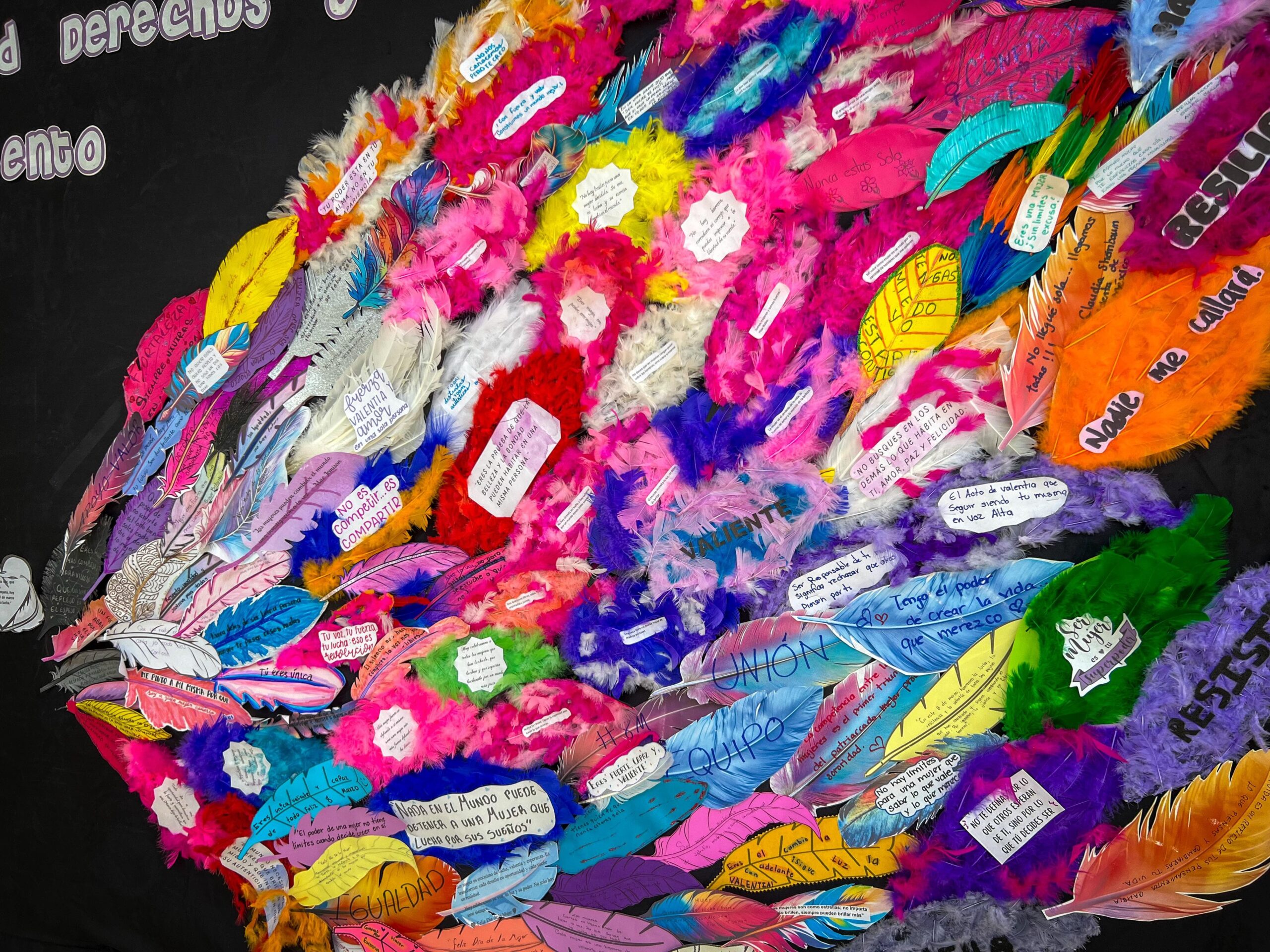 La obra representa la diversidad de las mujeres, donde cada una es una pluma que, al unirse, conforma unas alas que simbolizan la libertad y el reconocimiento de todas.