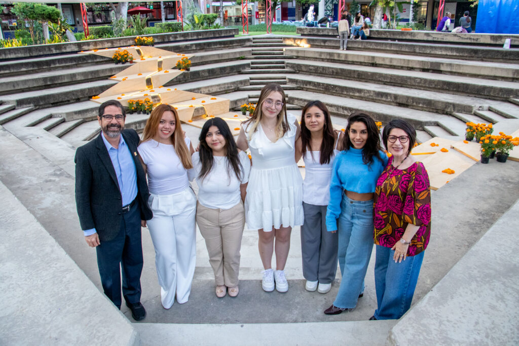Las estudiantes creadoras de la Licenciatura en Arquitectura de la Ibero Puebla, Mariana Fernández Sosa, Michelle Danielle Guevara Carrera, Vida Jocelyn López Requena, Suri Valeria Ramos Sánchez, y la ganadora y creadora del cartel oficial de esta ofrenda de la Licenciatura en Diseño Gráfico, Arantxa Vázquez Méndez, fueron reconocidas por las autoridades, entre las que también estuvo la Mtra. Adriana Quiroz Hernández.