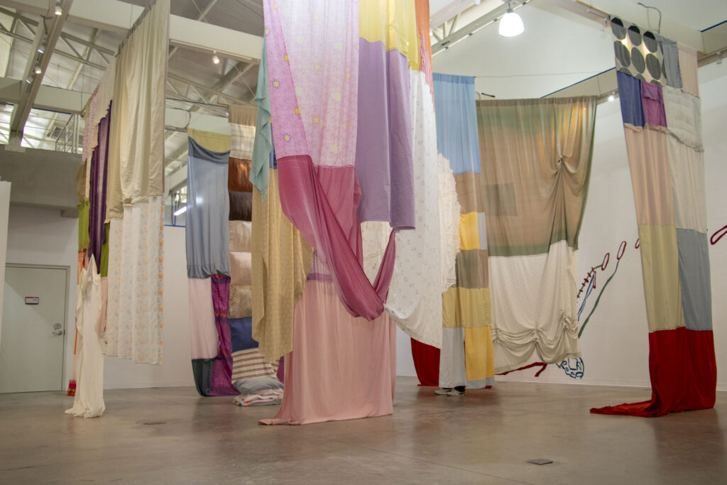Tiemblan las paredes de la casa de los sueños es una instalación textil que apuesta por invitar a la conversación respecto de las formas de construir colectivamente espacios a partir de las relaciones entre los cuerpos. Mediante la recuperación de materiales textiles de mujeres que acompañan la vida de Casazza —amigas, conocidas, familiares—, esta propuesta se erige insinuando un perímetro que podría asociarse con una casa, pero con la intención justamente de desbaratarla.