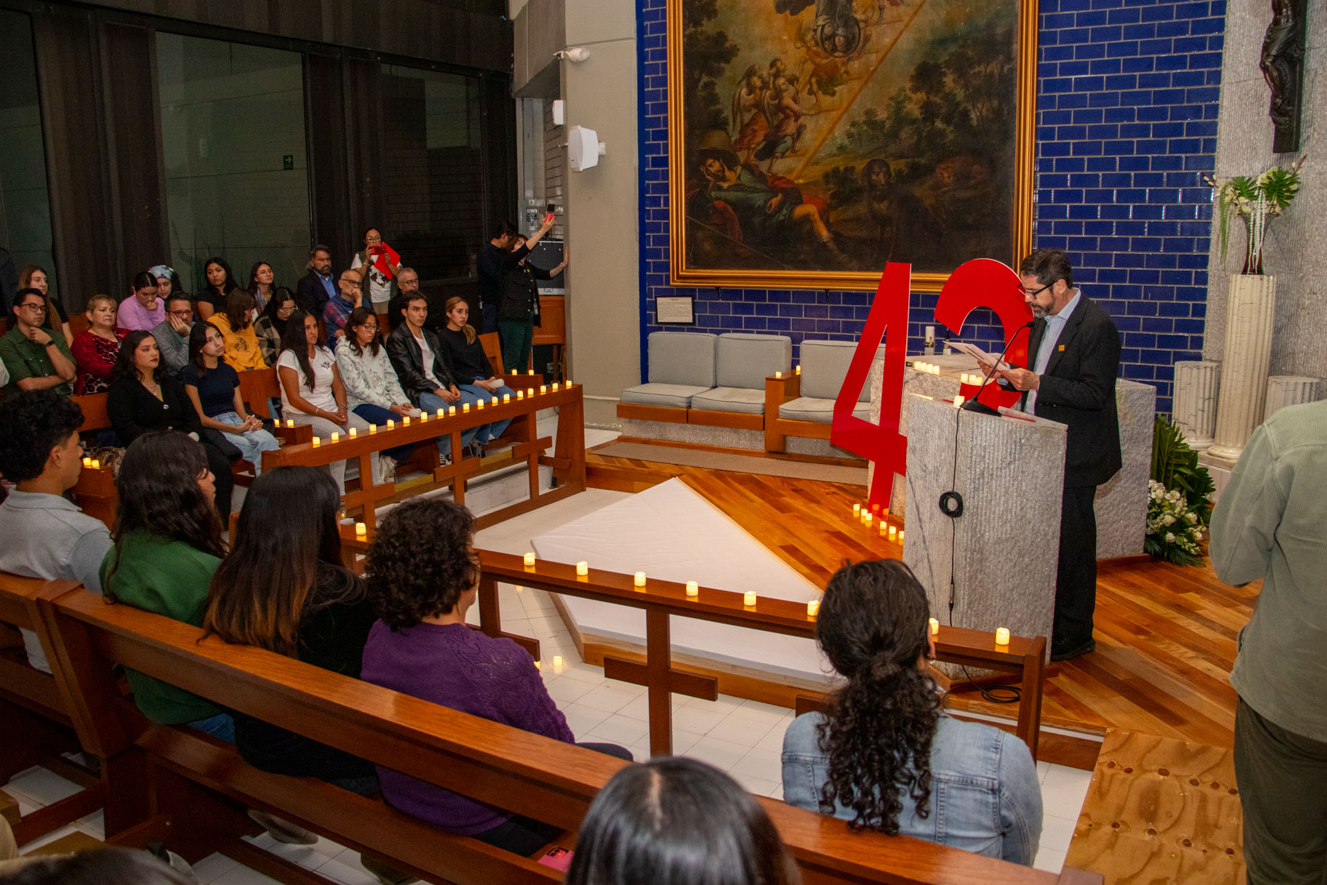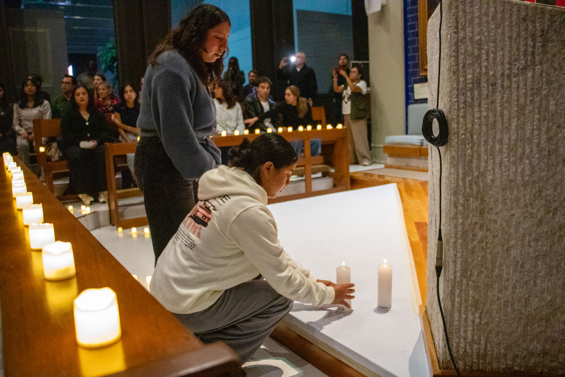 Por la noche, se encendieron 43 veladoras, y se entonaron cánticos de lucha y resistencia, en los que estuvieron presentes la esperanza y el deseo de que los normalistas y sus familiares encuentren paz. La jornada finalizó con una ceremonia religiosa en memoria de todas las personas desaparecidas en México, oficiada por el Mtro. Arturo González González, SJ, quien hizo un llamado a no olvidar, y no dejar de acompañar, esta causa.