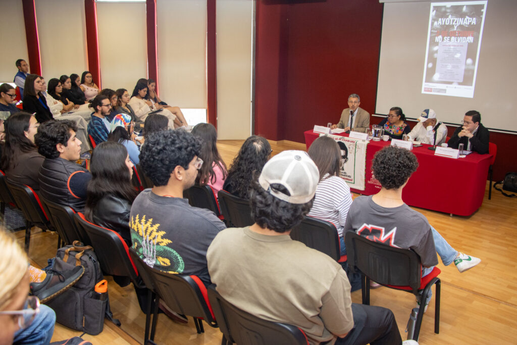 El Dr. Julio César Ávalos Huerta, coordinador de la Licenciatura de Derecho, abrió este espacio de intercambio y exigencia afirmando que “los hechos se conectan”, pues los 43 normalistas realizaban, como cada año, acciones de memoria, verdad y justicia en el marco de los 46 años de la matanza de Tlatelolco.