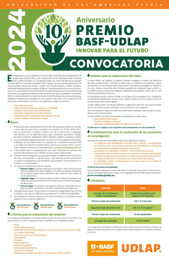 En el marco del décimo aniversario del Premio “Innovar para el Futuro”, la Universidad de las Américas Puebla (UDLAP) y la empresa BASF, convocan a estudiantes de nivel licenciatura y posgrado, a participar en este importante certamen el cual cierra la recepción de proyectos de investigación centrados en la construcción de soluciones sustentables, el próximo 30 de junio de 2024.